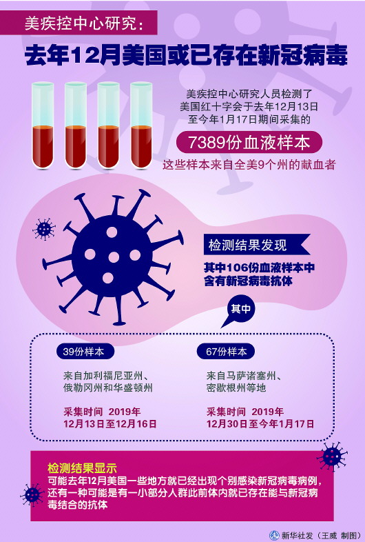 这项11月30日发表在美国《临床传染病》半月刊上的研究称,为了确定在美国首例新冠确诊病例之前是否有人体内存在新冠病毒抗体,美疾控中心研究人员检测了美国红十字会于去年12月13日至今年1月17日期间采集的7389份血液样本。这些样本来自全美9个州的献血者。