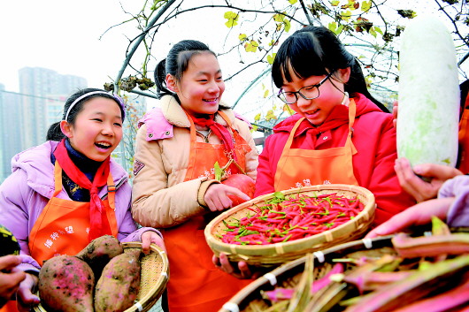 12月3日,在合肥市瑶海区临泉路第二小学的“空中农场”,小学生分享采收农作物的快乐。