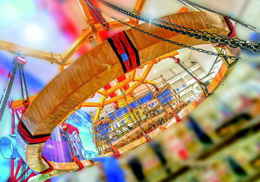 ▲工作人员在安装调试中国环流器二号M装置时进行环向场线圈外弧段吊装工作(2020年7月19日摄)。