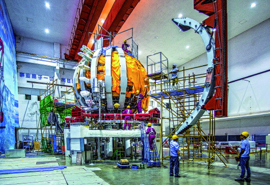▲中核集团核工业西南物理研究院的工作人员在安装调试中国环流器二号M装置时起吊线圈(2019年9月16日摄)。新华社发 |