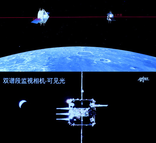 ▲这是12月6日在北京航天飞行控制中心指挥大厅拍摄的嫦娥五号上升器与轨道器返回器组合体交会对接画面。 新华社记者金立旺摄 |