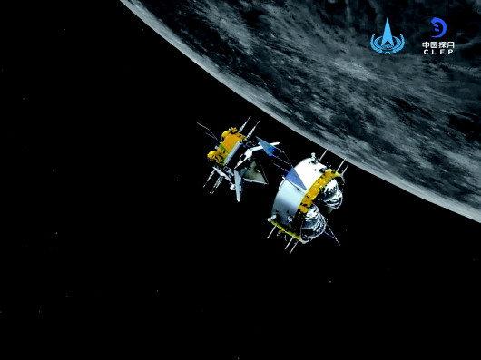 ▲轨返组合体与上升器分离后模拟图。记者从国家航天局获悉,北京时间12月6日12时35分,嫦娥五号轨道器返回器组合体与上升器成功分离,进入环月等待阶段,准备择机返回地球。 新华社发(国家航天局供图) |