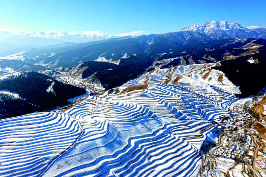 12月7日拍摄的甘肃天祝藏族自治县大红沟镇的梯田雪景。大雪时节,位于祁连山东端的天祝藏族自治县瑞雪初霁,景色迷人。新华社发(姜爱平摄)