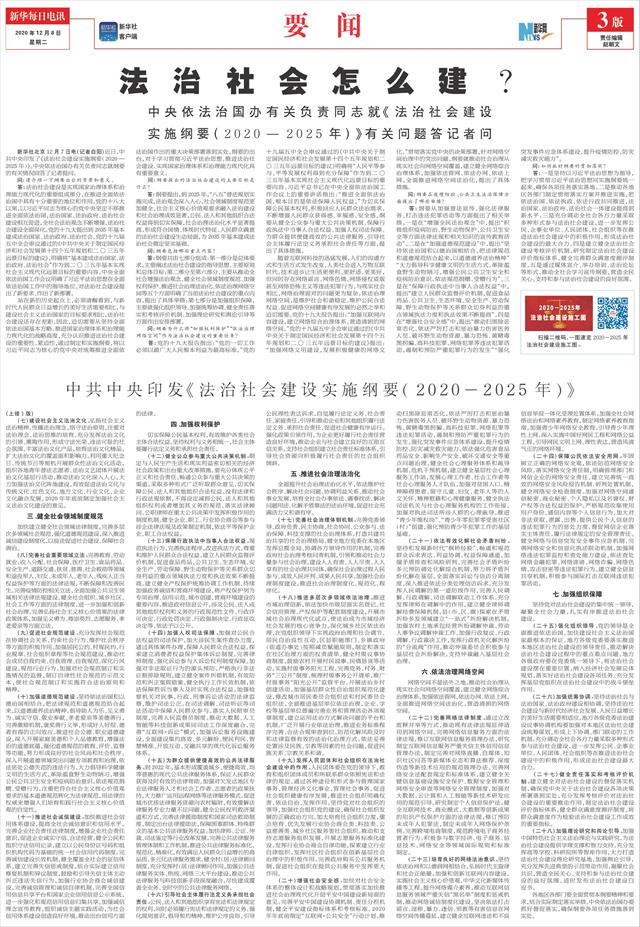 新华社北京12月7日电(记者白阳)近日,中共中央印发了《法治社会建设实施纲要(2020—2025年)》。中央依法治国办有关负责同志就纲要的有关情况回答了记者提问。
