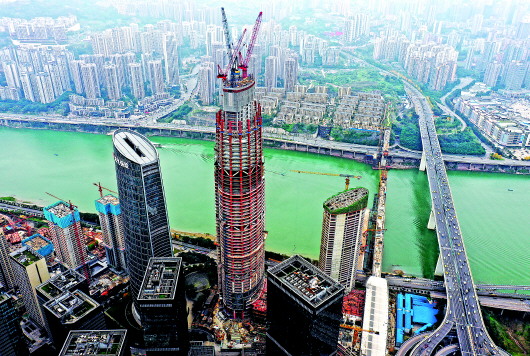 近日,重庆化龙桥超高层二三期项目主塔楼主体结构正式突破300米,该工程是集商业、办公于一体的超大型综合建筑群。 新华社记者王全超摄