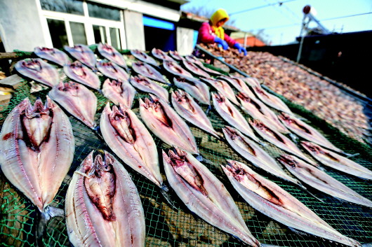 入冬以来,山东省青岛市即墨区沿海一带的渔民抓住晴好天气,忙着将捕获的鲅鱼、偏口鱼、鳗鱼等20余种海鱼进行切割、腌制、晾晒,加工成鱼干,以获得更高的附加值创收。