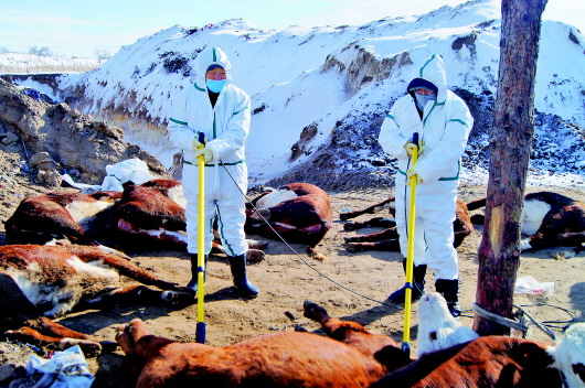 ▲11月24日,锡林郭勒盟正蓝旗农牧业综合执法大队工作人员在填埋场对病牛及检测阳性牛进行扑杀。 本组图片为受访者提供 |