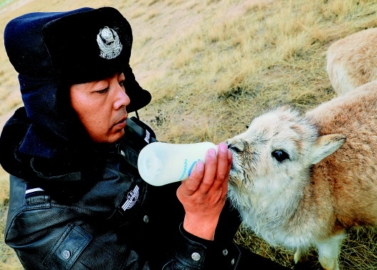 “你们已经吃饱了,该换小个头儿的啦。”邓海平把奶瓶从三四只小羊的“围攻”中抽出,转身将最后剩余的半瓶奶喂给了其中一只瘦小的藏羚羊。