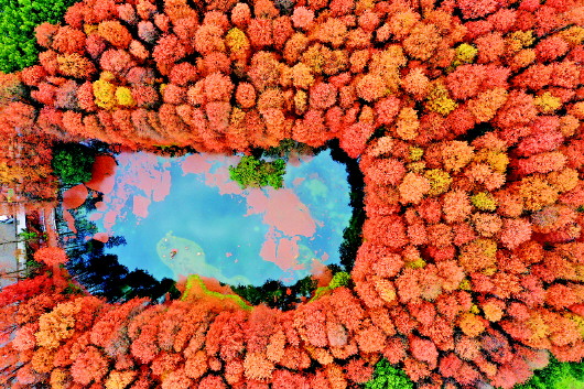 12月15日拍摄的湖北武汉东湖美景。初冬时节,湖北武汉东湖红叶如画,景色怡人。