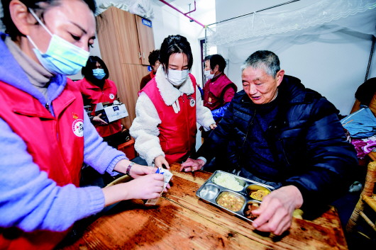 ▲12月11日,志愿者在诸暨市枫桥镇敬老院为行动不便的老人送餐。