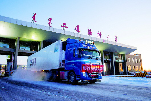 ▲12月15日,载着湖北省捐赠蒙古国防疫物资的车辆从二连出入境边防检查站通关。