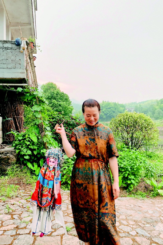 ▲季天渊与自己制作的泰顺提线木偶“贵妃娘娘”走在乡间小路上 本报记者崔力摄