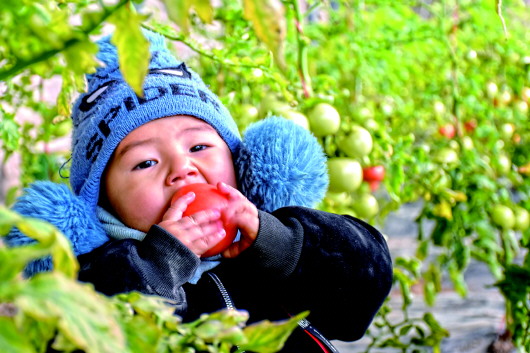 12月19日,在新疆阿克陶县的大棚内,图迪拜克·图尔汗的儿子在啃食新鲜西红柿。 |