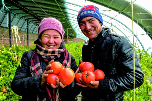 12月19日,在新疆阿克陶县的大棚内,菜农图迪拜克·图尔汗(右)和妻子布玛丽亚木·买买提依不拉音展示刚采摘的西红柿。
