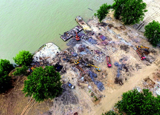 ▲2016年5月18日,工作人员在武汉余家头非法码头整治清理现场进行收尾工作。 新华社资料图片