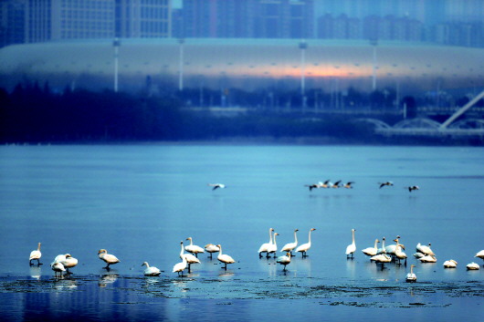 近年来,三门峡市积极改善黄河三门峡河段生态环境,每到冬季,越冬的白天鹅都会“如约而至”。 新华社记者许雅楠摄