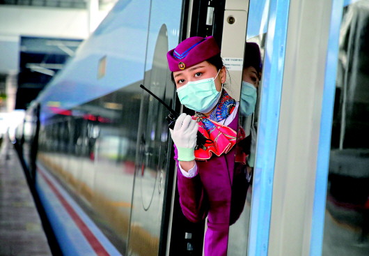 (下图)12月21日,一名乘务员在C6041次列车上工作。 新华社记者刘续摄