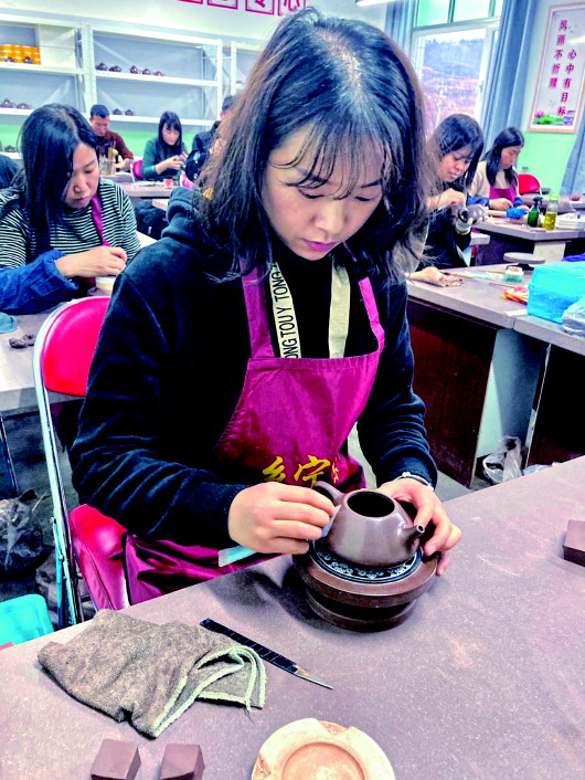 “90后”姑娘郑艳红大学里学习环境艺术设计,毕业后一直在外打工,听闻家乡开设了紫砂培训班,迅速报名参加。“学习结束后,打算先在县里的紫砂厂锻炼基本功,日后能在紫砂陶小镇上开一间自己的文创工作室。”她说。