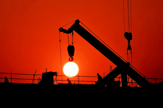 12月26日日出时分,工人在雄安站施工。京雄城际铁路雄安站建设已进入最后的收尾阶段,即将投入使用。 新华社记者邢广利摄