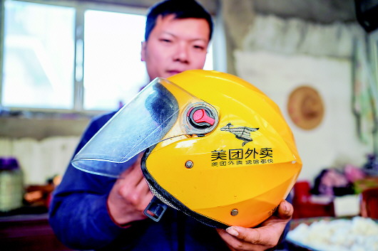 上图:外卖小哥陈凯在整理头盔,准备送餐(3月3日摄);下图:12月16日,陈凯展示自己之前使用的外卖头盔。