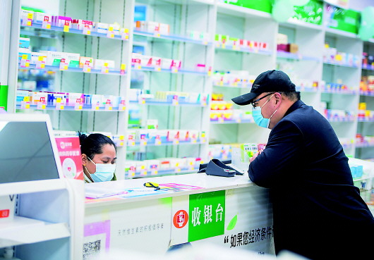 12月21日,武汉江岸区后湖街道惠民苑社区干事丰枫在药店咨询药品事宜。      新华社记者肖艺九摄