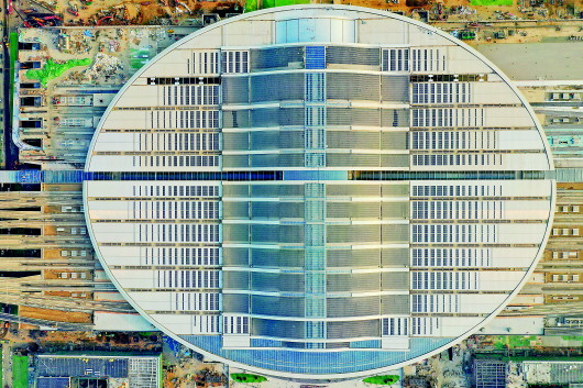 巨大的椭圆形屋顶则是一座光伏电站,铺设了4.2万平方米光伏建材,年均发电量可达580万千瓦时,每年能减少二氧化碳排放4500吨,相当于植树12万公顷。