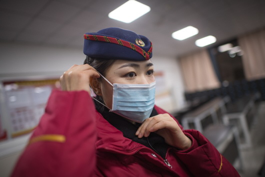 12月16日,武汉客运段高铁乘务员艾婷婷在上班前戴口罩。 新华社记者肖艺九摄 |