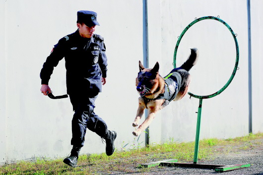 ◤近日,浙江省舟山市岱山县公安局巡特警大队警犬训导员引导警犬进行跳跃障碍训练。新华社发(邹训永摄)