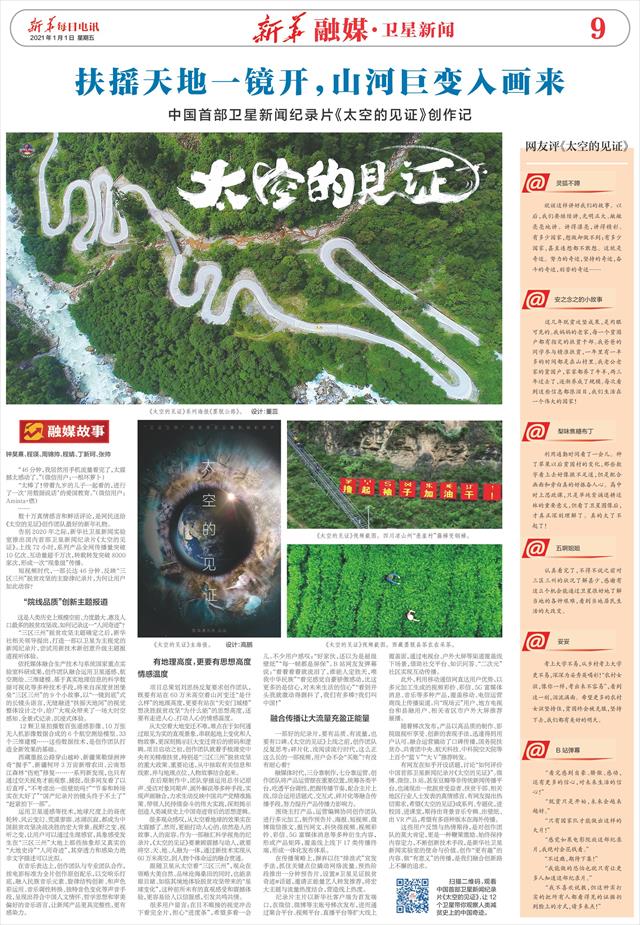 告别2020年之际,新华社卫星新闻实验室推出国内首部卫星新闻纪录片《太空的见证》。上线72小时,系列产品全网传播量突破10亿次、互动量超千万次,转载转发突破8000家次,形成一次“现象级”传播。