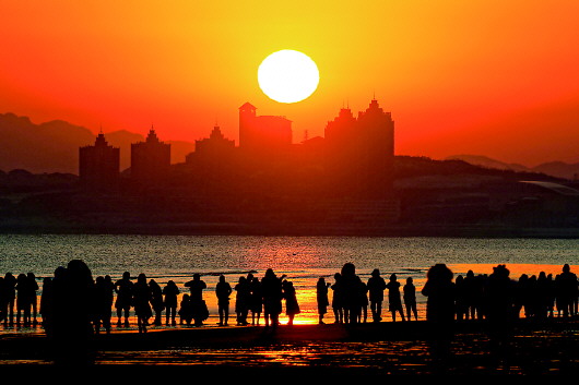 2021年1月1日,在山东省烟台市,人们在海边观看日出。当日是新年第一天,朝阳升起,万象更新。 新华社发(唐克摄)