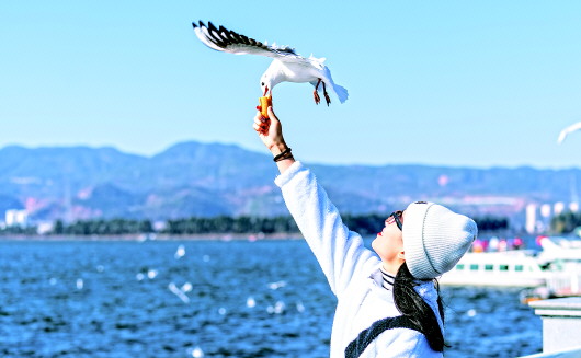 1月2日,游客在昆明海埂大坝给红嘴鸥喂食。 新华社记者王冠森摄
