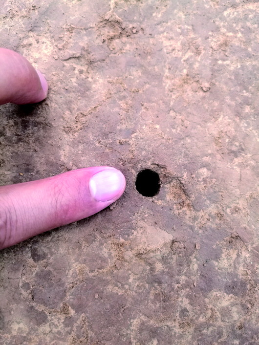 陶寺北墓地被探针扎出的痕迹。 组图由本报记者孙亮全摄 |