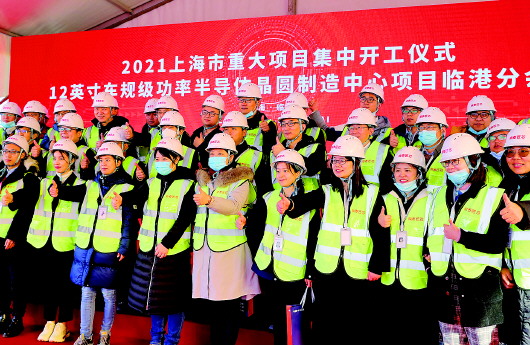 1月4日,企业员工代表在上海临港新城的12英寸车规级功率半导体晶圆制造中心项目开工仪式现场合影。