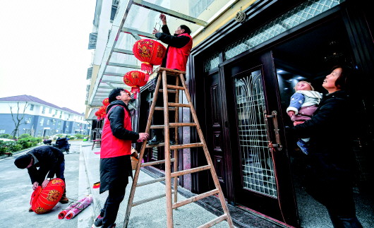 1月5日,在浙江省湖州市吴兴区东林镇星华村已建成的新农村新居,村干部和党员志愿者带着红灯笼和福字对联开展“迁新居 迎新年”活动,给搬入新村的村民们挂红灯笼、贴福字,同时了解他们的所需所急,送服务上门,努力让村民们搬得满意、住得舒心。据悉,从2020年下半年开始,东林镇星华村共有70多户村民陆续搬迁至新居。 新华社记者徐昱摄