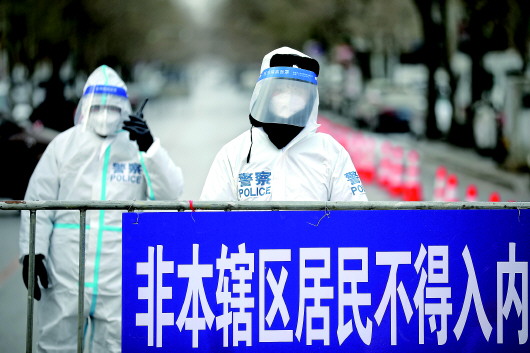 1月6日,在沈阳市皇姑区塔湾街明廉路疫情管控区域出入口,防疫工作人员在严寒天气中执勤。