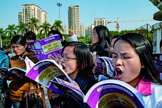 2011年1月1日,广东省东莞市。女工们利用假日时间自费学英语,跟着老师在广场上大声朗读。 |