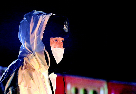 1月9日,一名民警在检查站执勤。为阻断疫情扩散蔓延,河北石家庄市高新区公安分局组织民警24小时在藁城区通往石家庄城区的道路上对来往车辆人员进行核查。 新华社记者金皓原摄