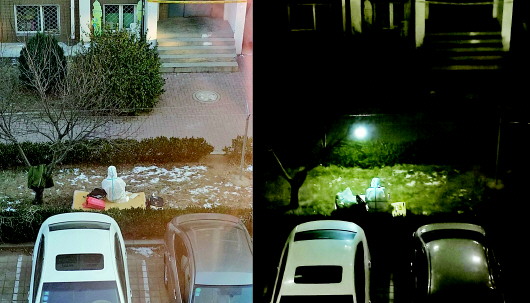 上图为社区工作人员刘莹辉白天在封闭管理小区居民楼下露天“办公”(2020年12月20日摄);下图为当天夜里,刘莹辉在同一地点继续工作。 新华社发 |
