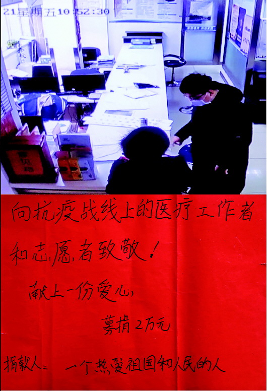 大家展开红纸,看到了两万元钱,纸上写着:向抗疫战线上的医疗工作者和志愿者致敬!捐款人:一个热爱祖国和人民的人。