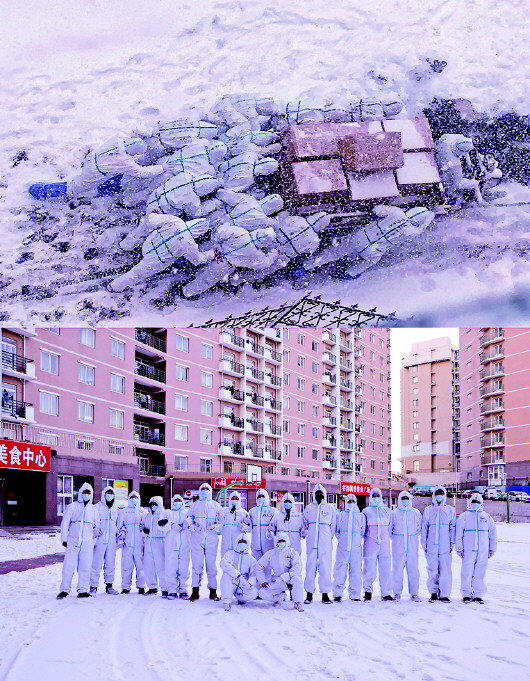 上图为1月6日,大连海洋大学师生顶风冒雪推车运送防疫物资;下图为当日,在风雪中运送物资的大连海洋大学师生在工作结束后合影。 新华社发 |