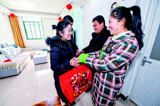 1月13日,在位于诸暨的全兴精工集团,工作人员将过年礼包送给留下过年的安徽员工王睛(左一)和邱奎(左二),他们是夫妻,住在公司分配的两室一厅的家庭房中。该公司有1800多名外地员工,其中已经有1300多人表示将留在诸暨过年。随着春节的临近,为减少集中流动带来的防疫隐患,解决企业年底用工需求,浙江诸暨市多部门联合各企业共同推出多项暖心举措,包括给留下过年的外地员工提供爱岗敬业红包、年货大礼包、布置年味宿舍、安排错峰休假等,倡导在诸暨工作的外地员工春节期间留在诸暨过年。 新华社记者徐昱摄