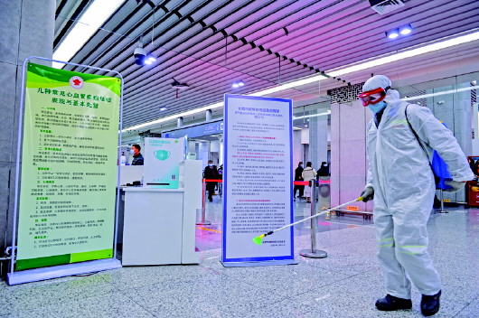 1月13日,在合肥南站,进行消杀的工作人员走过一台口罩自动售卖机。