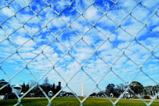 国会大厦是安保的重中之重。大厦外围已竖起至少两层2米多高的黑色金属防攀爬栅栏。里层栅栏后面是全副武装的国民警卫队队员,每隔几米就是一个岗位。大厦内也提升了安保级别,进入大厦需通过层层关卡,众议院议事厅入口还新安装了金属探测器。