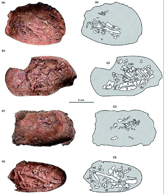江西赣州的这组化石,除成年窃蛋龙外,还有24个墨绿色的蛋,个头略大于鸵鸟蛋,它们呈上下三环排列,有7个蛋的蛋壳已破碎,露出了7个胚胎,而这些胚胎正处于不同的骨骼发育阶段。
