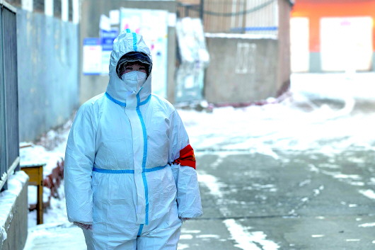 1月15日,志愿者在望奎县前进街道佳兴小区内巡逻。 新华社发(张涛摄) |