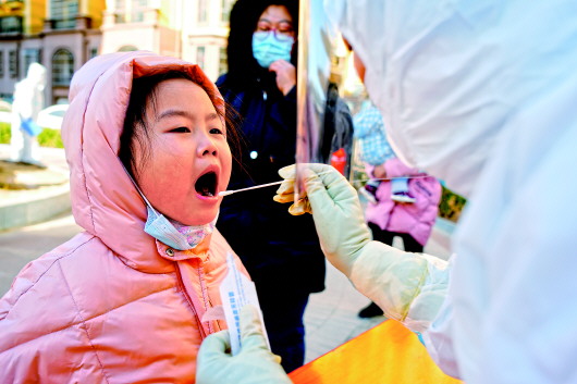 1月17日,医务人员在河北省邢台南宫市翰墨儒林小区核酸检测采样点采样。当日,河北省邢台市抽调1690名医务人员奔赴南宫,协助进行第三轮全员核酸采样、检测工作。新华社发(苗伟摄)