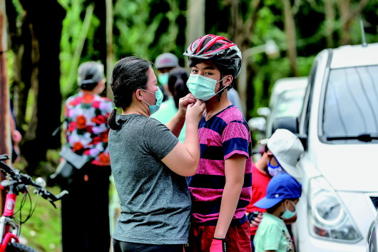 1月17日,一名戴口罩的女子在菲律宾奎松的一所大学里帮她的儿子戴防护头盔。菲律宾卫生部17日通报说,该国累计新冠确诊病例500577例。 新华社发(乌马利摄)