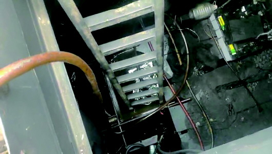 记者在一艘船上发现油污水直排的情况,图片中可以看到,有一个抽水泵和软管深入舱底油污水。