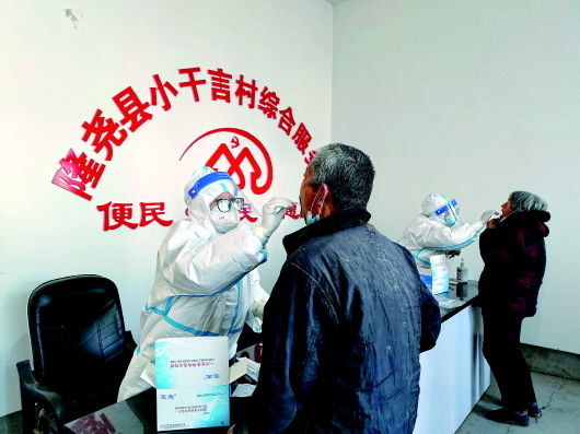 1月18日,在河北省邢台市隆尧县小干言村综合服务中心,任泽区人民医院医护人员为当地居民进行核酸采样。