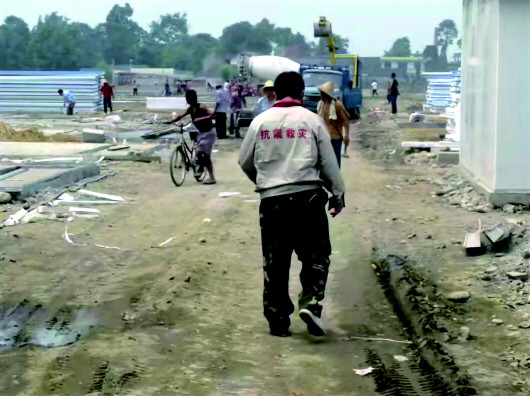 2008年6月,安磊在四川什邡“抗震救灾”前线从事志愿服务,搬运简易板房的保温板。 |